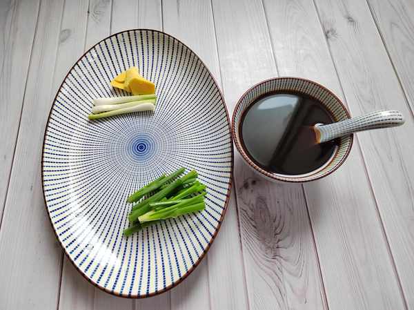 2、準備一些蔥段和薑片;碗裡倒入半碗清水,加入鹽、生抽、蠔油、紅燒醬油、蔥薑、米醋、白糖拌勻,調成料汁。
