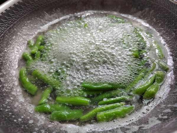 2、四季豆清洗幹凈,摘掉兩邊的豆筋,掰成小段,放入開水鍋中,淋入少許油,大火把四季豆煮熟,撈出過涼,控幹水分。
