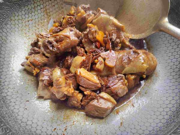 2、起鍋燒油,放入雞肉和薑片爆炒出香味,再加入生抽、蠔油、料酒、紅燒醬油、八角、桂皮、香葉、冰糖、麻辣火鍋底料炒勻。