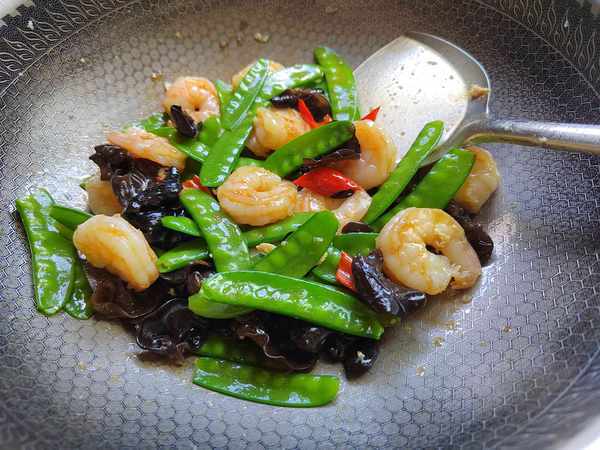 3、起鍋燒油,放入蝦仁中火煎熟,再放入荷蘭豆、木耳和蝦仁翻炒片刻,加入鹽、生抽、蠔油炒勻即可。