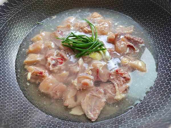 1、雞肉處理幹凈,冷水下鍋,加入蔥薑和料酒,大火煮10分鐘,把浮沫撇掉,撈起沖洗。