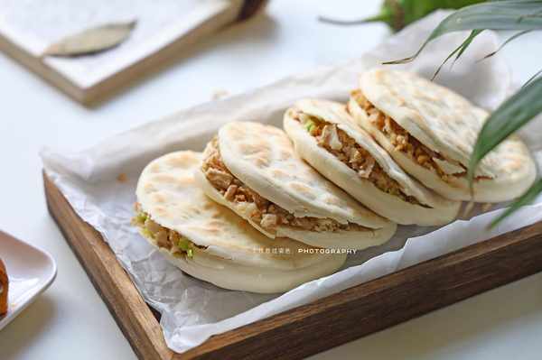 5.取一個白吉饃,用刀切成兩半,但不要切斷。將切好的肉夾在白吉饃裡,熱乎乎、香噴噴的肉夾饃就做好啦!