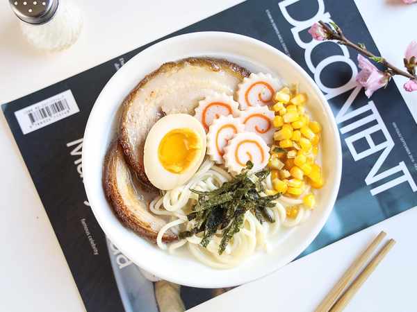 9.拉面湯沒有熬制骨頭高湯,用的是面條湯沖制的。煮好的拉面撈出放入湯裡,逐步鋪上叉燒片、溏心蛋、玉米、海苔即可