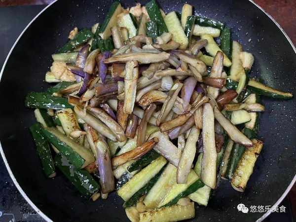 6.食材炒出香味之後再放入備好的黃瓜,用鏟子將它們炒均勻。然後再把茄子也倒入鍋,用鏟子把它們炒均勻;