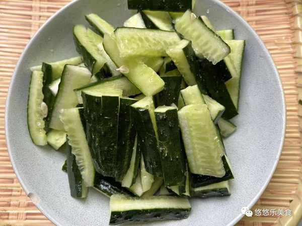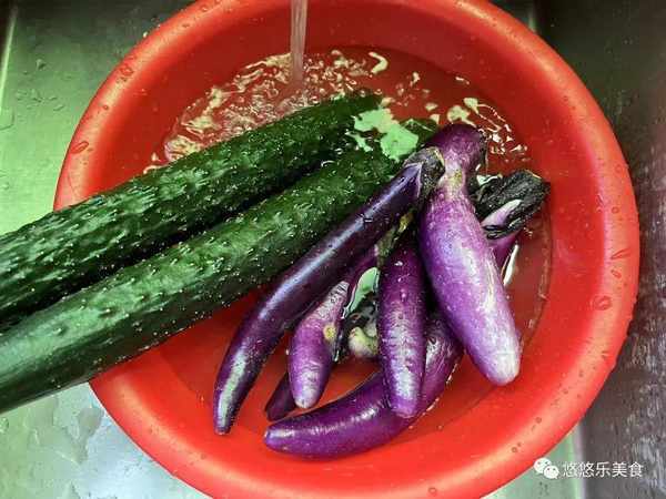 2.如果說切久擔心會氧化的話,可以放在盆裡面加入適量的水跟食鹽放著浸泡。浸泡可以使得茄子表面不會氧化,泡後要煮的話再用清水沖洗一下。把黃瓜的表面搓洗幹凈,黃瓜表面洗幹凈之後放在案板上也是對半切開再給它改刀切成長條狀,切好後的黃瓜放在一旁備用;