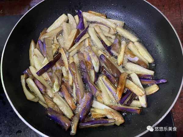 4.下鍋後把茄子撈出擠幹水分放入鍋裡面,茄子下鍋小火煸炒。把鍋中的茄子的表面煸炒至微微焦黃,炒至微微焦香之後再將茄子撈出放在一旁備用。茄子先下鍋炸一下,這樣子煮出來的茄子口感會更加的鮮美好吃;