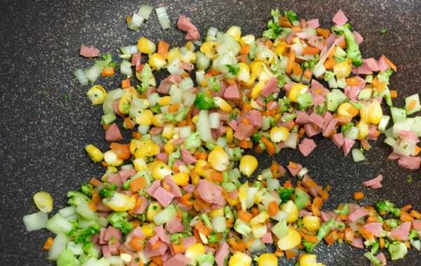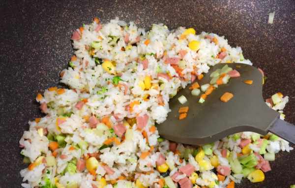 7、接著把玉米粒和火腿碎倒進去翻炒。