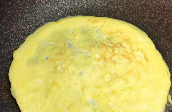 5、鍋裡倒入適量的雞蛋液,不要一次性都倒進去,足夠攤成薄餅的量就可以瞭,剩下的留著備用,鍋開小火,兩邊翻面煎,不要煎得太焦瞭,像圖片裡的顏色就可以瞭。