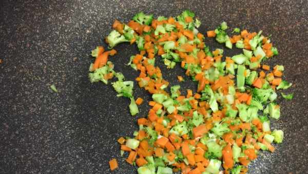 1、把胡蘿卜和黃瓜洗凈去皮,切成小細丁,西藍花洗凈切碎,火腿腸切碎,玉米把玉米粒剝下來,下鍋煮熟,撈出備用。