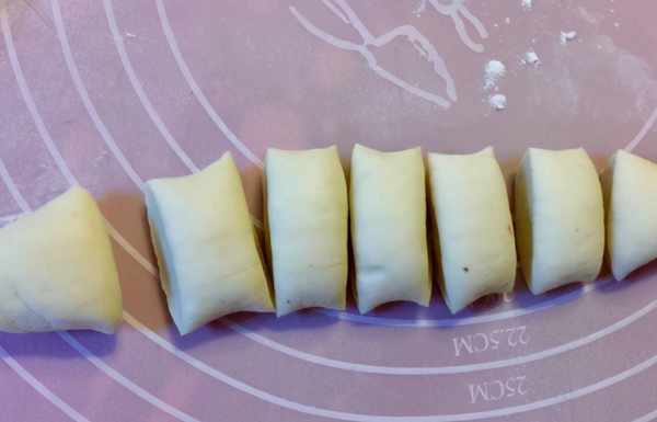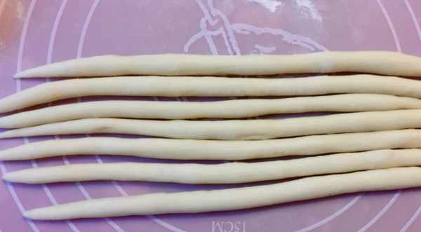6、把每份面團像圖片裡一樣,均勻的揉成長條。