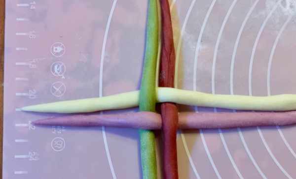 7、重復上面的步驟,把另外的三個面團也均勻的分成七份,揉成長條,然後用保鮮膜蓋住,防止變幹。