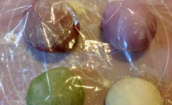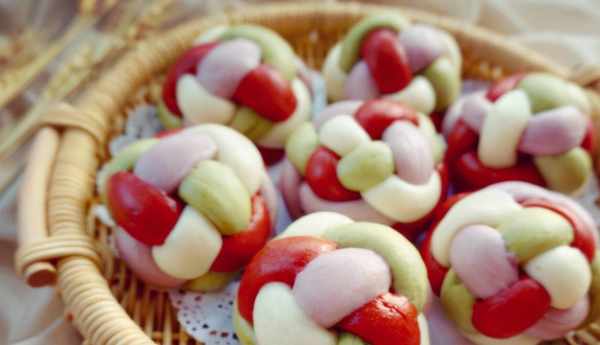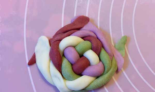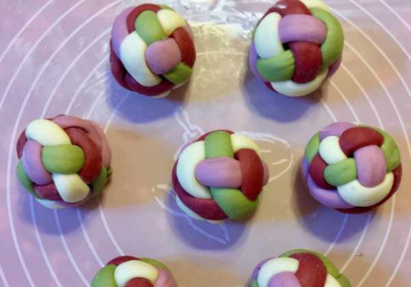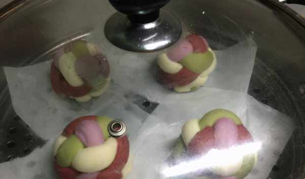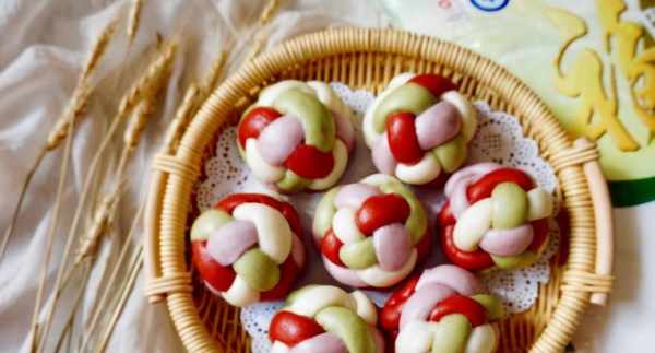 [所需菜品]:面粉160克,酵母,水,白糖,紅豆沙,紅曲粉,抹茶粉,紫薯粉。