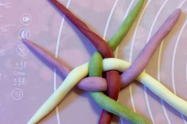 8、接著開始編繡球,像圖片裡一樣,把每個顏色的長面條都拿出來一個,交錯著編在一起。