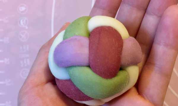 11、把編好的繡球皮翻個面,把捏好的豆沙餡包在中間。