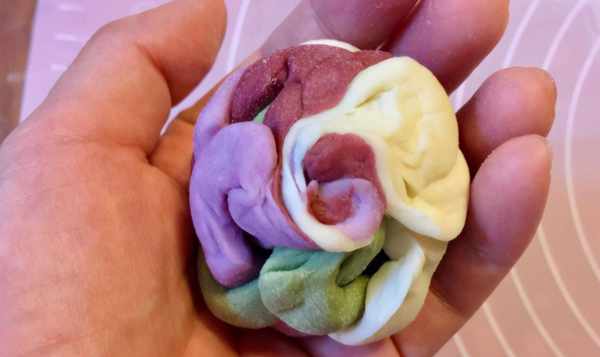 2、把揉好的面團均勻的分成四份,其中三份分別放進紅曲粉,抹茶粉和紫薯粉,用手慢慢地揉進面團裡,一定要揉均勻,不然蒸出來的顏色不好看,估計要揉個十分鐘左右。