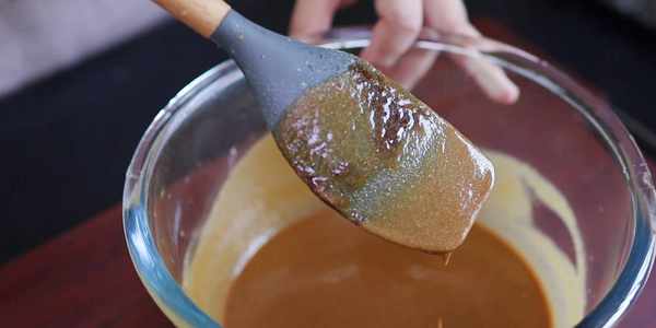 5、趁熱把糖漿倒在糯米粉漿裡面,攪拌成顏色一致、細膩順滑的紅棕色粉糊。