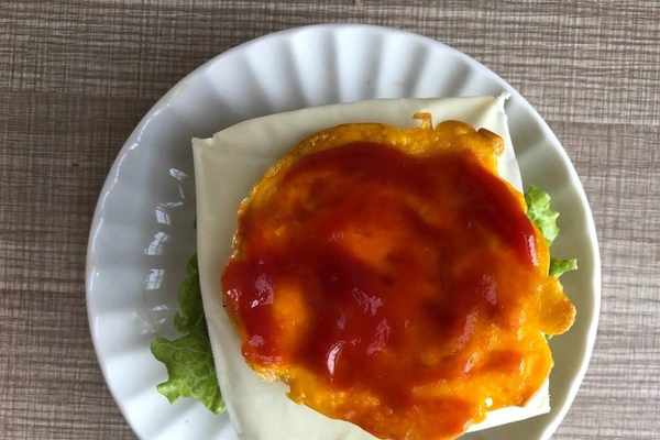 8、然後開始組合漢堡包,先放一塊面餅,然後生菜+牛肉餅+番茄醬+芝士片+雞蛋+番茄醬+最後再放上面餅,就可以瞭。美味的方便面漢堡包就做好瞭,是不是很簡單,食材的話大傢還可以根據自己的喜好來添加。