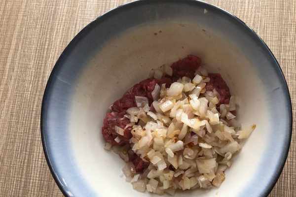2、炒熟瞭之後將過洋蔥碎盛出來放入牛肉餡中,牛肉餡可以自己剁,也可以買來現成的牛肉餡。