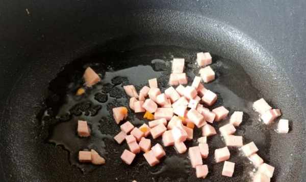 5、炒雞蛋用的食用油不用扔掉,繼續加熱,要是不夠的話就再加一點,把午餐肉下進去翻炒至金黃色,把隔夜的米飯下進去炒散。