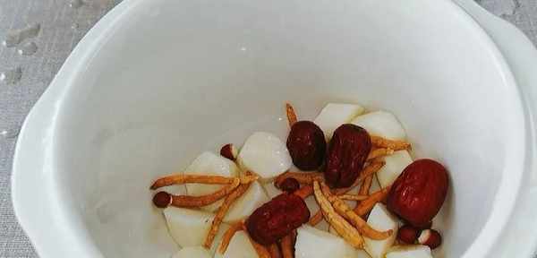 紅棗營養非常的豐富,拿來燉湯,有非常好的滋補作用,清洗幹凈的紅棗也放入燉盅裡。