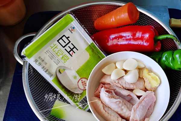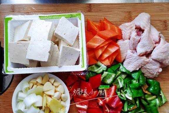 2、雞翅一分為二剁成2段,豆腐切1.5厘米厚的片,胡蘿卜切菱形片,青紅椒去蒂去籽也切菱形片,大蔥切小段,薑切片,蒜切大粒
