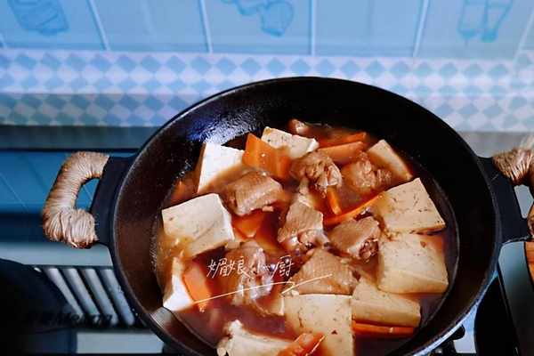 5、加入豆腐和胡蘿卜片,適量鹽,大火再次煮鍋內沸騰,又調成小火煮10分鐘,豆腐入味