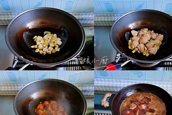 4、炒鍋燒熱,加油,下入蔥薑蒜炒出香味,用小火避免炒糊瞭。接著放入雞塊,中火翻炒約2分鐘,等雞塊變微微黃色,再加入2勺料酒去腥增香,2勺生抽提味,1勺紅燒醬油上色,半勺蠔油提鮮,翻炒均勻讓每一塊雞塊都完全沾裹上調味料且色澤變紅潤,再加入開水沒過食材並高出1.5個食指指節的水量,加入10克冰糖,大火煮沸騰後轉小火,蓋上鍋蓋煮15分鐘