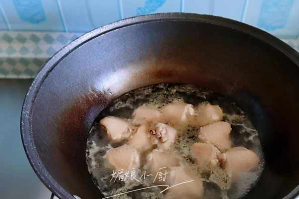 3、雞翅涼水下鍋,大火燒沸騰,轉中火煮雞塊變色,去除血沫,撈出再用熱水沖洗幹凈肉塊上的浮沫,瀝幹水