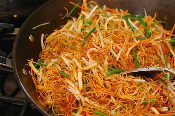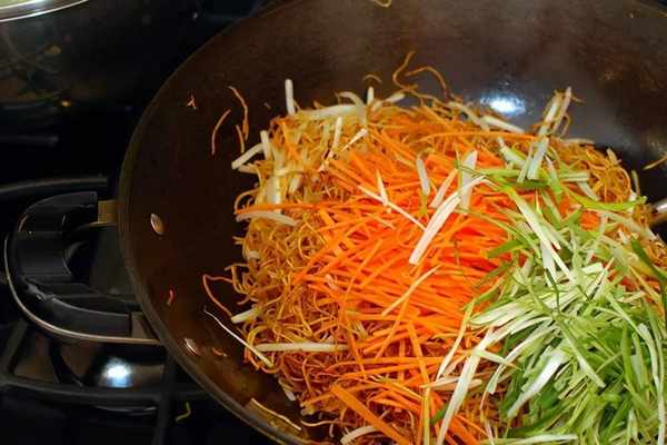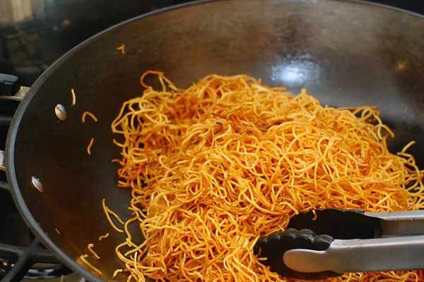 接下來,加熱更多的油,然後加入面條。因為香港面條已經煮熟和幹燥,所以它們煮得很快,而且保持松散和分開。炒面時,將抹刀放在一邊,用鉗子或筷子夾住,以幫助您在不壓碎或折斷面條的情況下操縱面條。