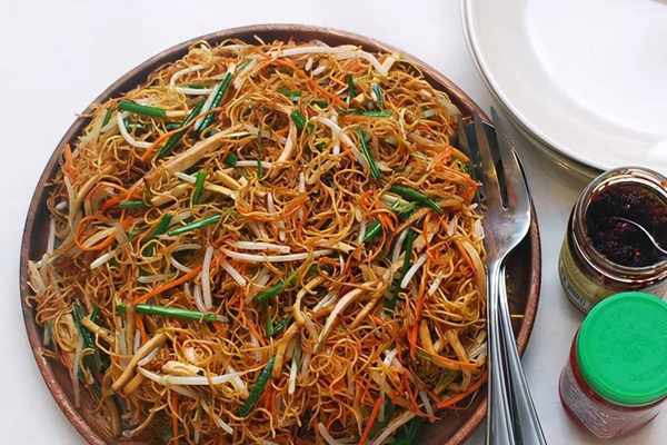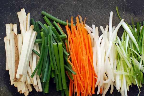 我的經典點心版本使用相同的面條、豆芽和大蔥,但我還加入瞭切碎的胡蘿卜、韭菜和五香豆腐切片。