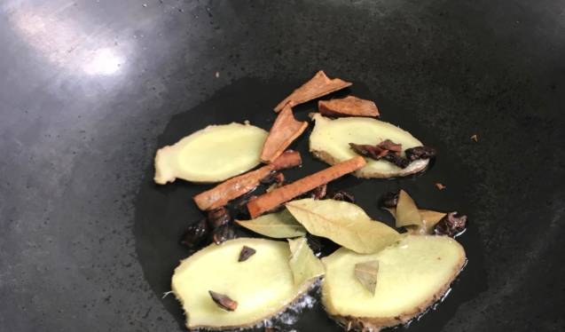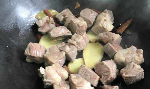 4、另起鍋,鍋裡面加入適量的食用油,燒熱。把生薑片,八角還有香葉和桂皮爆香,再將焯好的牛肉粒下進去炒出來香味。
