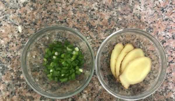 1、生薑切成片,小蔥用清水洗幹凈切成蔥花準備好。