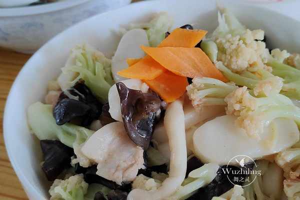 還有這道【花菜炒白果】老福州人喜歡的主食,準備少許的肉絲花菜胡蘿卜和黑木耳,白果一起翻炒,加入料酒、糖、福州魚露、胡椒粉和雞精,奢侈一些的可以放入2隻螃蟹一起炒,就更加鮮美瞭。