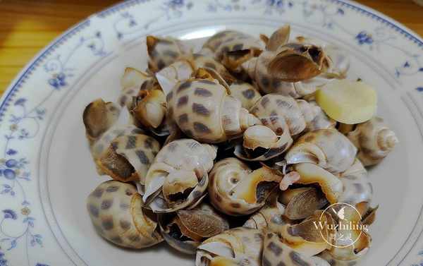 【白灼花螺】最近花螺雖然貴瞭一些,但是好吃貴一些還是值得買的,將近2斤,水開放入花螺,加點料酒和薑片,大的花螺煮的時間要久一些,看見螺肉殼開始掉瞭就可以撈出來。
