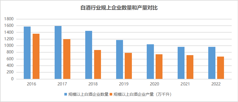 據中國酒業協會數據,近年來,規模以上白酒企業總數量和總產量均處在不斷下滑狀態。2016年—2022年,規模以上白酒企業總數量由1578傢下降至963傢,降幅達38.97%;同期總產量由1358.36萬千升下降至671.2萬千升,降幅超50%。