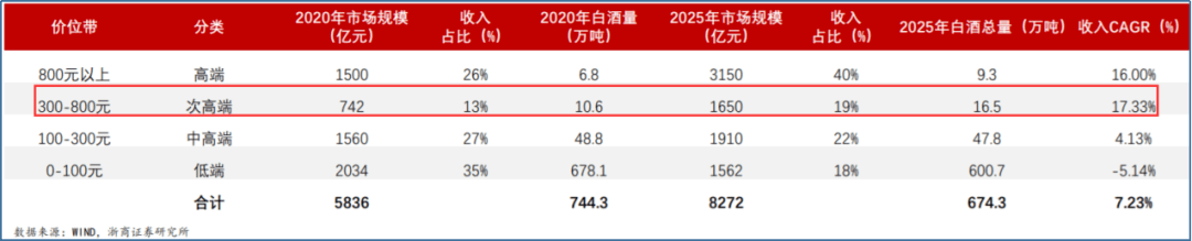 浙商證券研究報告顯示,2020年國內次高端白酒市場規模為742億,在國內白酒市場占比13%,預計到2025年市場規模將達1650億,占比提升至19%,復合增速為17.33%,高於同期高端白酒市場復合增速的16%。