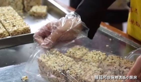 塊。隨著溫度降低,凍米糖漸漸冷卻下來瞭,再不切開要變硬瞭,變硬後就不好切瞭。大叔拿起一把切刀,將整大塊凍米糖切成整大條,將整大條切成一片片。待冷卻後,切過後的地方留下一條條虛線,沿著線,就能將整大塊凍米糖掰成一塊塊瞭。香米味凍米糖就做好瞭。