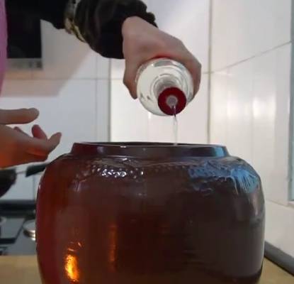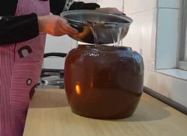然後將滾好的大料水倒入裝雞蛋的壇子裡。