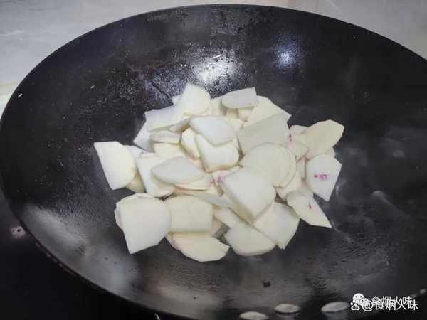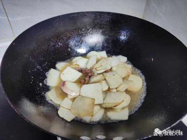 鍋中的食材炒香瞭之後,我們再把紅蘿卜片放入裡面;