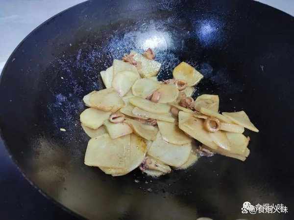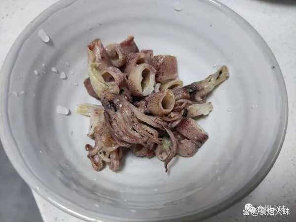 3.準備一個幹凈的盆,把盆裡面的水燒幹,然後放入油,接著我們把魷魚圈放入裡面,用小火炒一下,煸炒出香味來;