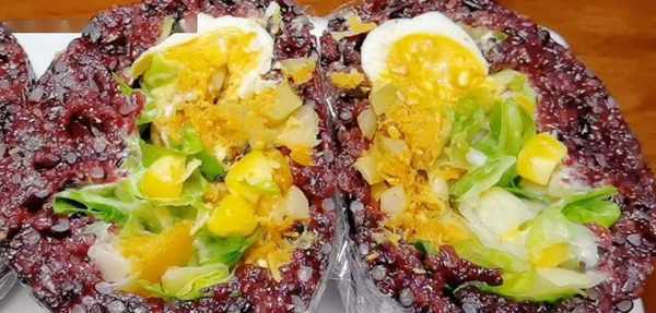 大傢在做黑米飯團的時候,記得別隻放黑米哦,一定要放一些糯米在裡面,這樣吃起來口感會更好哦。裡面的配料不一定要這些食材,可以按照自己的口味來添加哦。而且還要把黑米和糯米提前6個小時浸泡好,這樣煮出來後米裡面才不會有硬芯,更好吃