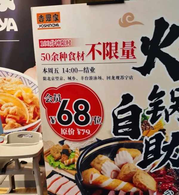 與和府撈面和老鄉雞不同的是,吉野傢不僅推出單品火鍋按份賣,這次還以“自助”的形式,68元每位,主打高性價比!