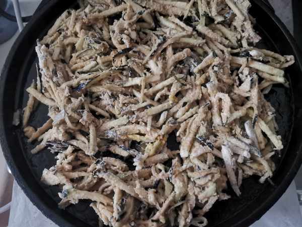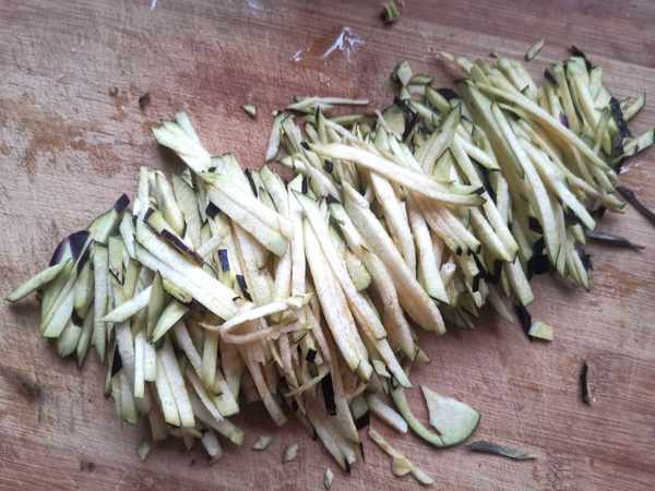 第二步:把用刀茄子切成細絲。如果切不成細絲,可以用擦絲器來代替就可以了。