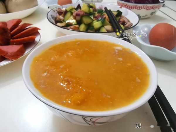 配的粥是小米南瓜粥,小米和南瓜的營養大家都知道,不但適合中老年人,也很適合孩子喝。特的做法也很簡單,把南瓜切小丁,和小米一起熬0分鐘即成。