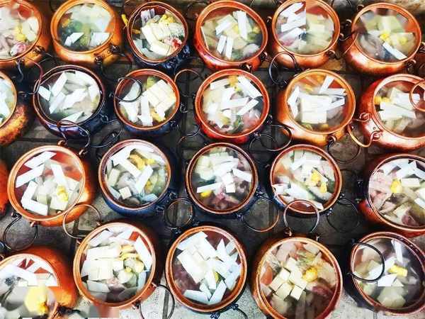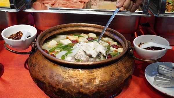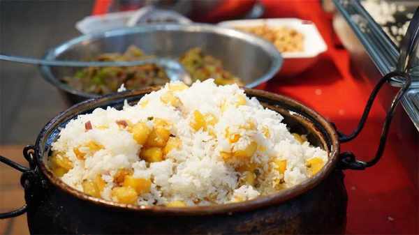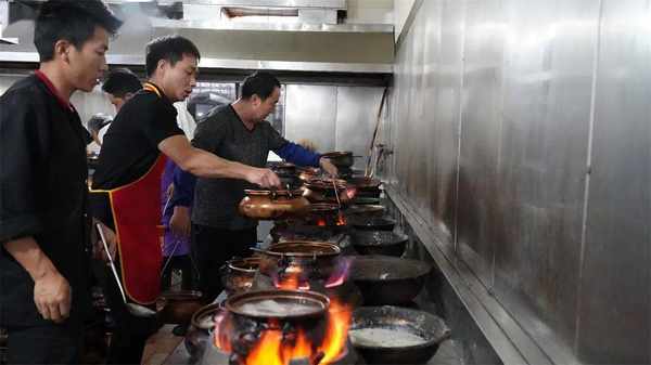 在“三道菜”後廚,記者看到,專門用於煮銅鍋魚和銅鍋飯的爐灶便有10多個,有的師傅們動作嫻熟地將魚宰殺、切塊、稱重,隨後和豆腐、蘿卜分別放進170多個銅鍋裡煮,有的師傅不停地用銅鍋將洋芋油炸好後放入米飯燜。短短幾分鐘,一鍋鍋鮮美的銅鍋魚和鮮香的銅鍋飯便快速上到瞭遊客的餐桌上。