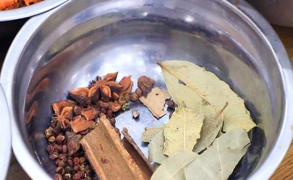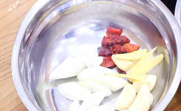 輔料:大蒜、生薑、蔥白、幹辣椒、花椒、八角、香葉、桂皮
