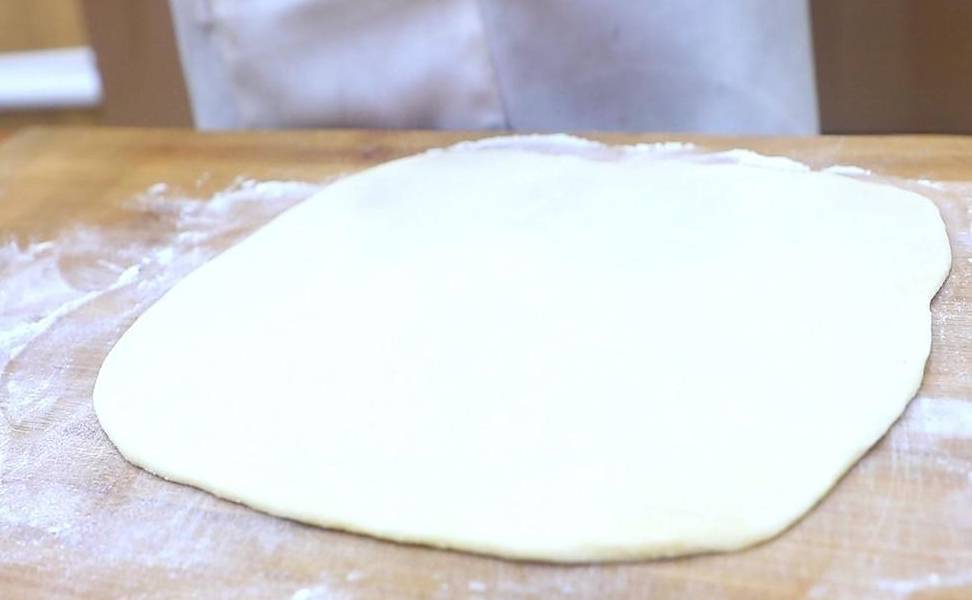 燉雞塊的時間,我們準備面條,案板上撒上底面把餳好的面團取出不用揉,揉面容易起筋破壞延展性,直接摁扁搟成長方形的面片,打去邊緣不整齊的地方。