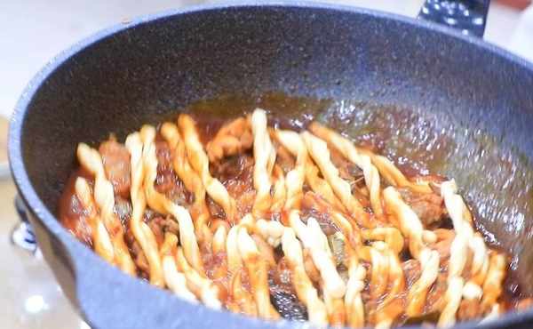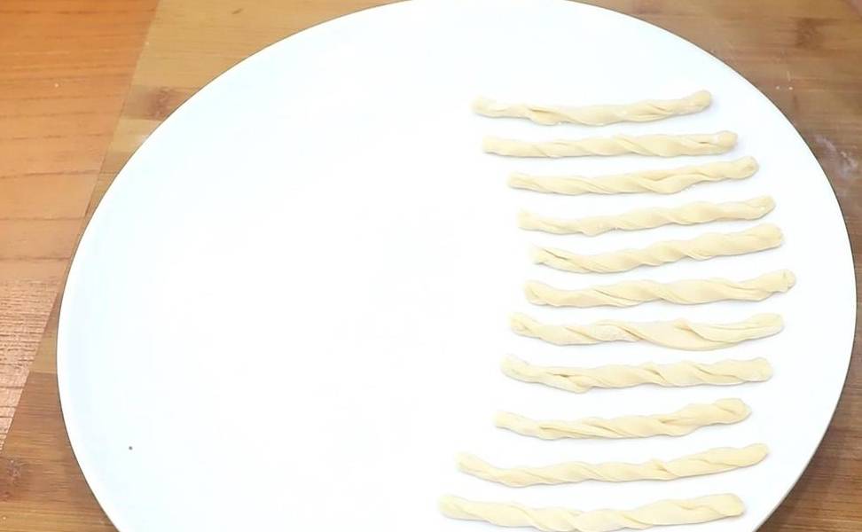 然後把面片從中間切開,再改刀成一厘米寬的長條,再把面條抻長對折起來,如下圖所示那樣搓成麻花狀即可。