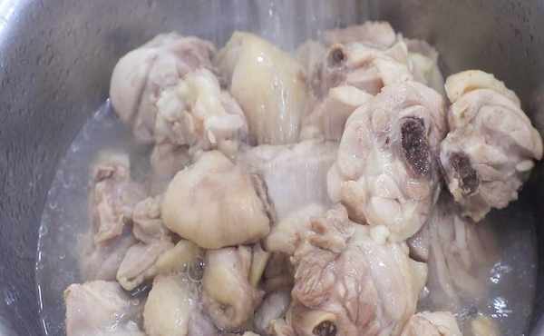 水燒開以後,把雞塊倒入鍋中經常翻動讓其均勻受熱,慢慢煮出雞塊中的血水和雜質,水再次沸騰後把鍋中的浮沫打幹凈,煮至沒有雜質溢出我們把雞塊盛出來,用清水沖洗幹凈備用,清水沖洗能使雞肉更加緊實、有嚼勁。