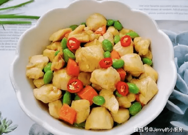 鍋內加油,燒熱後倒入雞丁,炒到變色盛出。留底油放入大蒜爆香,再倒入毛豆翻炒。